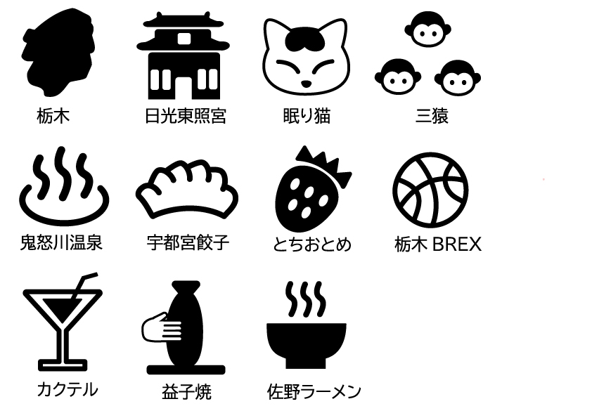 テーマは「栃木県」です。栃木県の観光名所や名物をピクトグラムにして、観光マップや観光WEBサイトなどで使うことを想定して制作してみました。全体のデザインとしては、図形の枠線を太めにしたり、角を丸くすることで柔らかい印象になるようにしました。