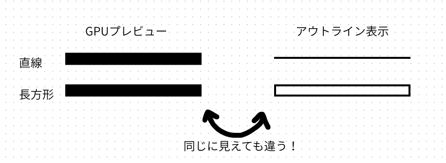 Illustratorで直線を描いて太さを大きくすると、見た目は長方形のように見えることがあります。しかし、このままではあくまで「線」として扱われており、図形として認識されていません。そこで、線を選んだ状態で「オブジェクト → パス → パスのアウトライン」を実行すると、線が図形データに変換され、長方形などのオブジェクトとして扱えるようになります。
